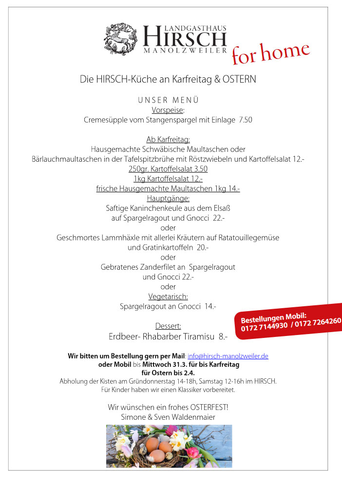 Landgasthaus Hirsch • Kaiserstraße 8 • 73650 Manolzweiler07181-41515info@hirsch-manolzweiler.de